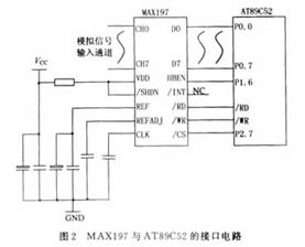 数据采集和A/D转换由MAX197完成。MAX197是MAXIM公司出品的高性能12位A/D转换器,8通道模拟信号输入,可以满足使用1片A/D分时进行多参数测量的要求。MAX197的其中2路通道为电池重量信号的输入,由压力传感器获取原始信号经运算放大后输入。其余6路分别为电池相关电压、电流各参数信号的输入。MAX197片选信号/CS接AT89C52的P2.7,读写控制信号分别接AT89C52的/WR和/RD。引脚HBEN为12位转换结果选择端,由P1.6控制。当HBEN为高电平,读取转换结果的高4位;当HBEN低电平时读取低8位。设定MAX197的控制字为01000000B,则其工作方式为正常工作方式/内部时钟;内部获取方式;模拟量输入范围为0~5 V;使用通道0。改变控制字的最后3位(000~111)可以依次选取MAX197的第0~7通道。MAX197通过片内的三态并行接口与AT89C52进行接口。由于MAX197本身的转换时间较短,且为固定值,故而在设计时采用了固定延时的方式代替中断方式,进行转换结果的读取,提高了数据的通过率和程序的效率。图2给出了MAX197与AT89C52的接口电路。
